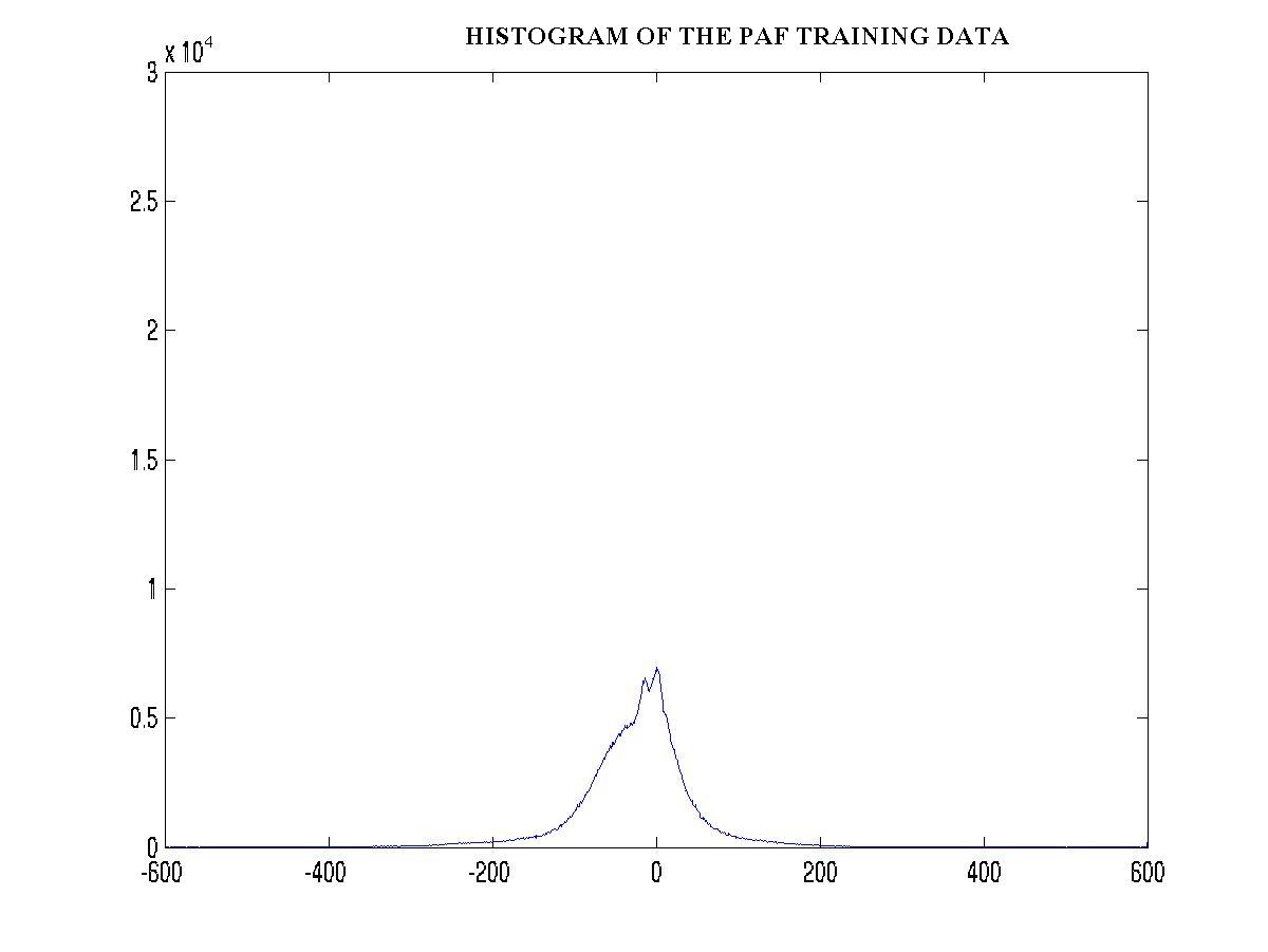 Since the original data was continuous, it had to be discretized. The number of discrete levels was selected to be 20. Furthermore, in order to facilitate the manipulation of the observation probability distribution B, the data was digitized. The figure below shows a block diagram describing the process of digitization. Following that are figures showing the histograms of the PAF and NO PAF training data that helped in the selection of the 20 initial estimates (figures7,8). Hence the data was finally mapped to 1 of 20 symbols. The training was performed using the Baum-Welch algorithm iterated 5 times, and the classification of the test data was performed by calculating the log-likelihood versus each of the two models using the forward procedure.