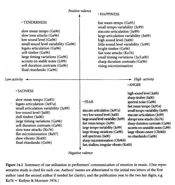 Juslin, Patrik N.: gCommunicating Emotion in Music Performance: A Review and Theoretical Frameworkh in Juslin, Patrik N. & Sloboda, John A. (eds.) gMusic and Emotion: Theory and Researchh, Oxford University Press (2001)
