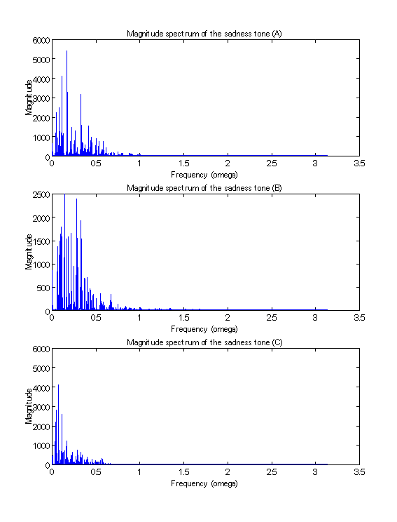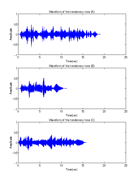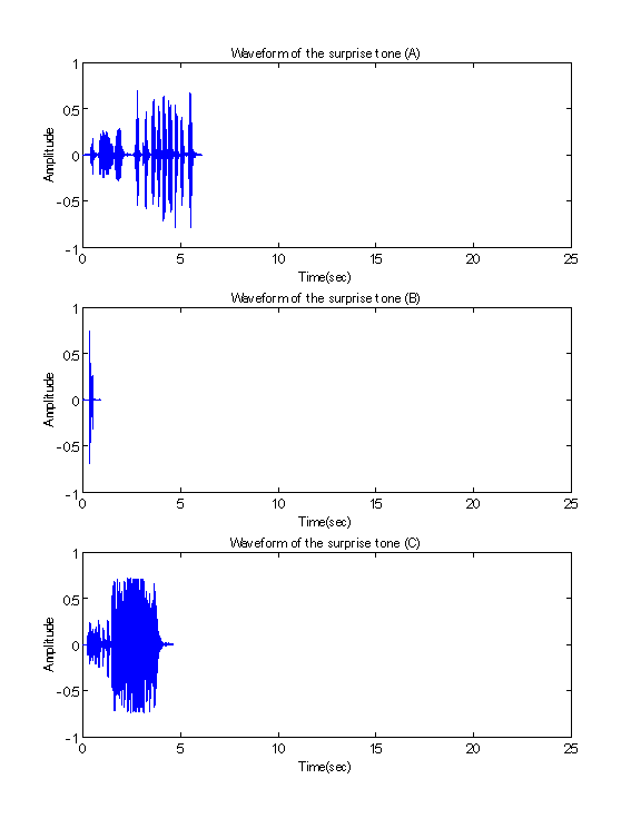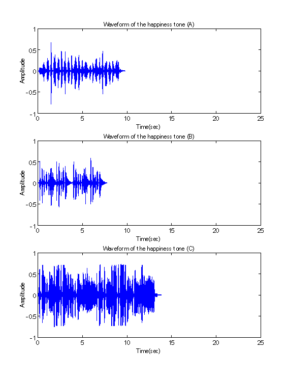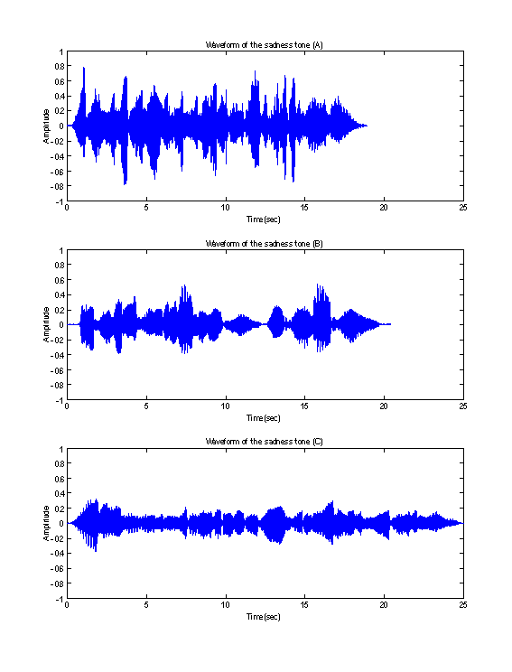 Three female amateur violinists played 0.3 to 25 second passages expressing various emotions. They played either improvised or previously composed pieces in the studio. They played in the following order in a quiet music studio.